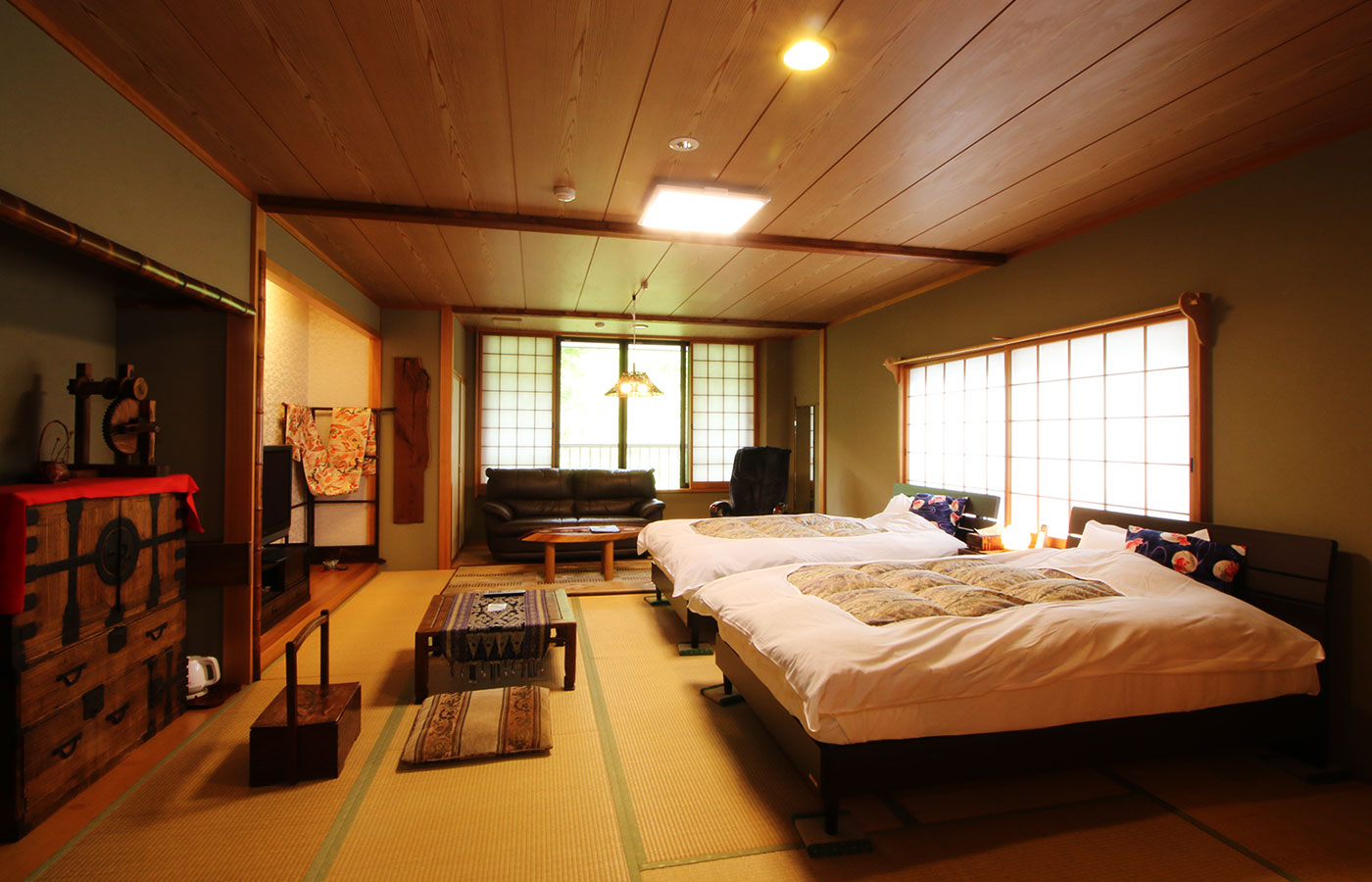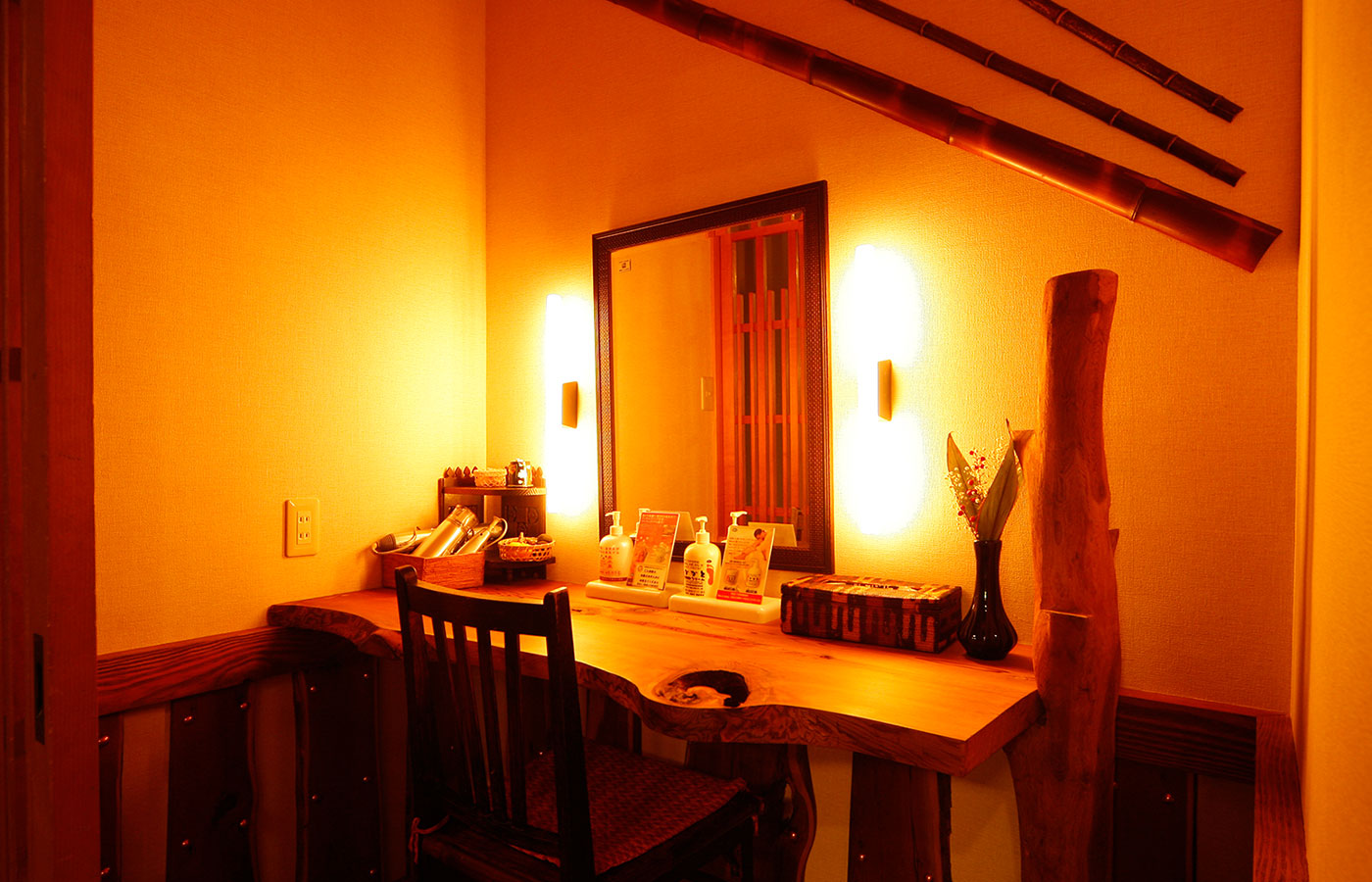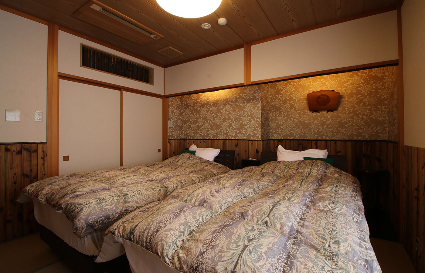 アンティーク家具や調度品が飾られた和ツインの「時子の間」。17畳の広々したお部屋にはセミダブルのツインベットと機能的かつ落ち着いた雰囲気の和風のパウダールームを完備。 ※マッサージチェア完備。 設備 >